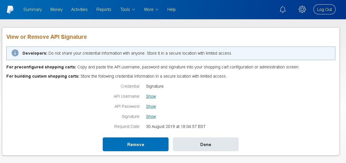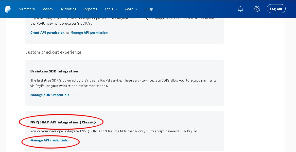 On the page that opens scroll down to ‘NVP/SOAP API integration (Classic)